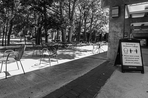 A seating area behind the Case Campus Center at Skidmore College awaits the arrival of students. The college is among several in the region that aim to resume in-person classes this month.Joan K. Lentini photo