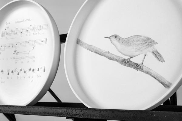 A detail view of Jimena Sarno’s “taracata trabaja” (2018), shows an image of the hornero, the national bird of Argentina, on ceramic plates. The sound installation, with music by Axel Krygier based on the bird’s song, will be included in “Kissing through a Curtain,” which opens March 21 at Mass MoCA. Photo courtesy of Massachusetts Museum of Contemporary Art