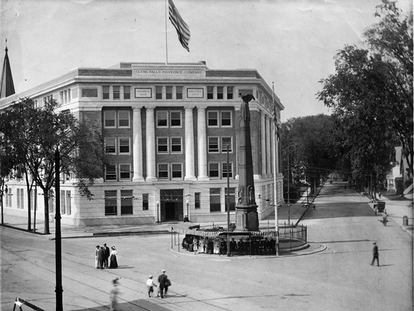 For much of the 20th century, the corner of Glen and Bay streets was the site of the Glens Falls Insurance Co., whose five-story, marble-columned edifice dominated the intersection known as Monument Square. The landmark building, whose front door faced the Civil War monument at the center of the intersection, was razed in 1976. Though its loss was long mourned by architecture and local history buffs, the lot has remained vacant ever since.