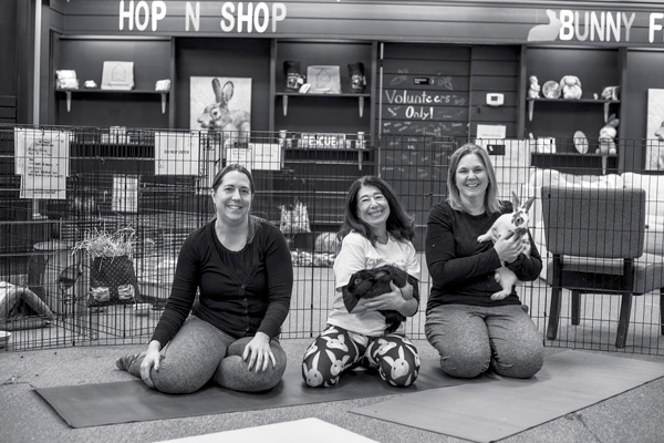 Rabbit “foster mom” Brandy Caro, yoga instructor Jamie Lemnotis and yoga student Stephanie Lyons enjoy a moment with the rabbits after a Bunny Yoga class at Hop on Home, a rabbit rescue and adoption organization, at its space at Wilton Mall in Saratoga County. Joan K. Lentini photo